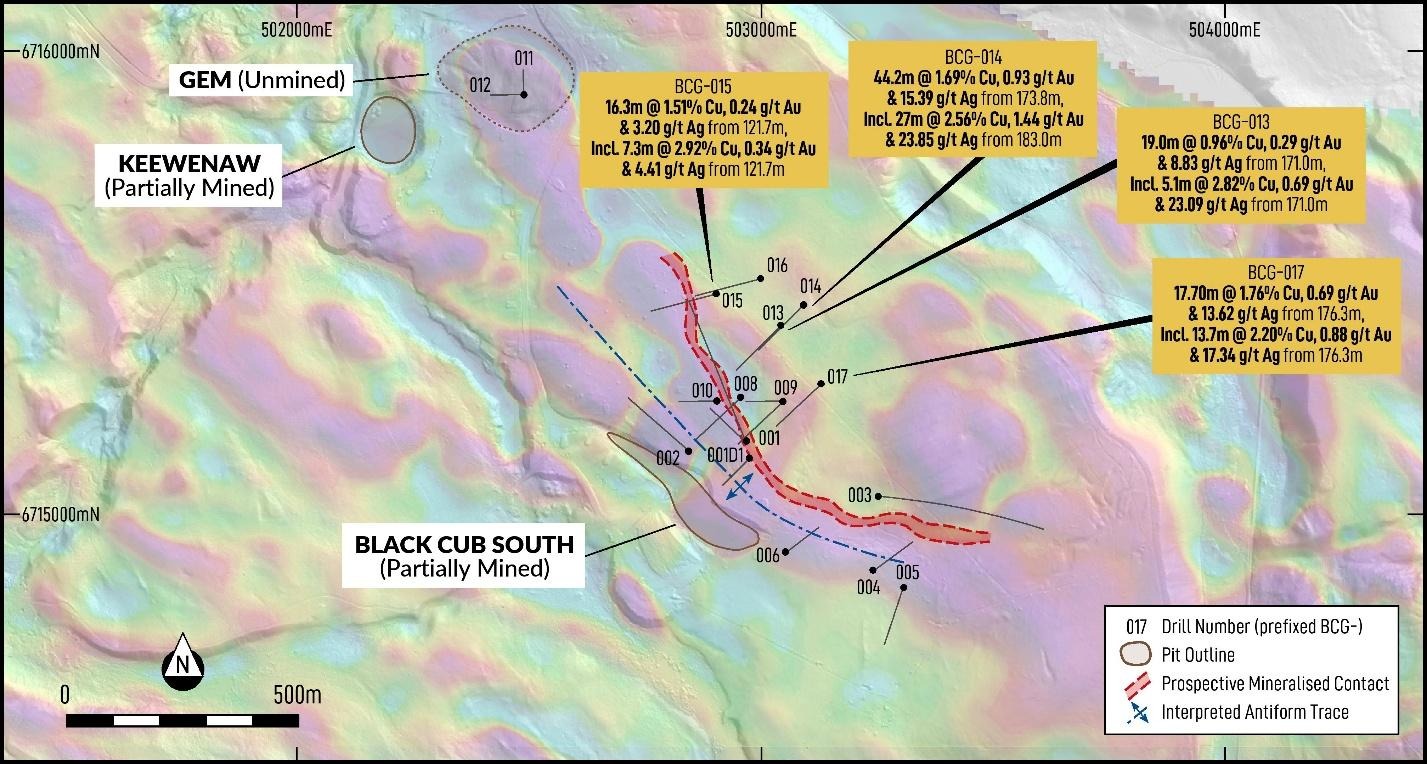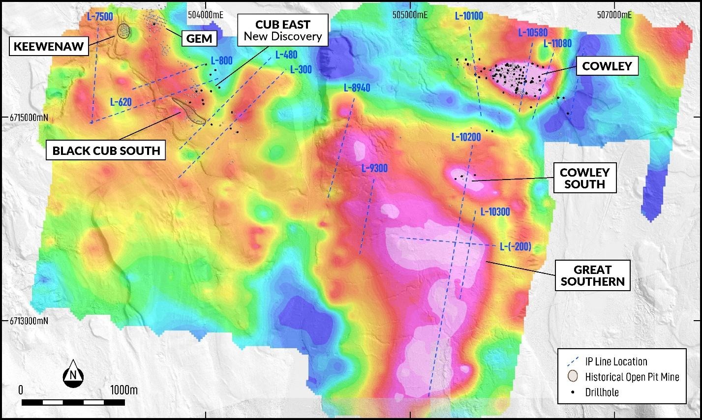 Drilling at Cub East is planned to further test mineralization discovered in late 2025 from drilling that targeted Induced Polarization (IP) and gravity anomalies beneath shallow cover (see Figure 3).