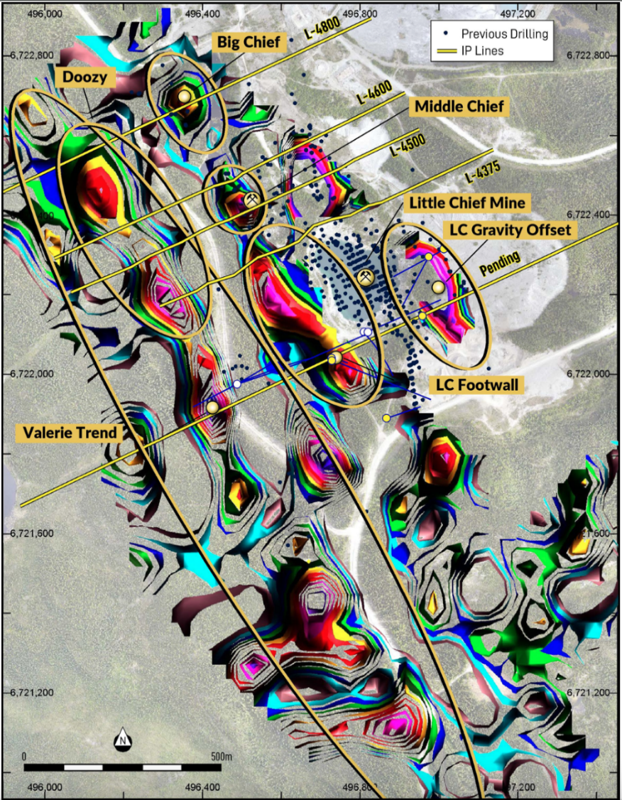The initial IP survey was strategically centered around the main historic area to better understand the geological and structural settings, thereby supporting future drill targeting at Middle Chief, Big Chief, Little Chief & Valerie. To broaden coverage, the three northern lines were extended westward, specifically to investigate a non-magnetic density anomaly recently named “Doozy.” This anomaly was identified by Gladiator from ongoing, highly detailed gravity surveys. The target had previously gone undetected by earlier explorers due to its low magnetic response. The gravity anomaly consists of two high intensity nodes that occur over approximately 600m of strike and are separated by what is interpreted to be the western continuance of the east-west trending mineralized “North Fault” that daylights in the northern wall of the historic Little Chief open pit located approximately 400m to the east.